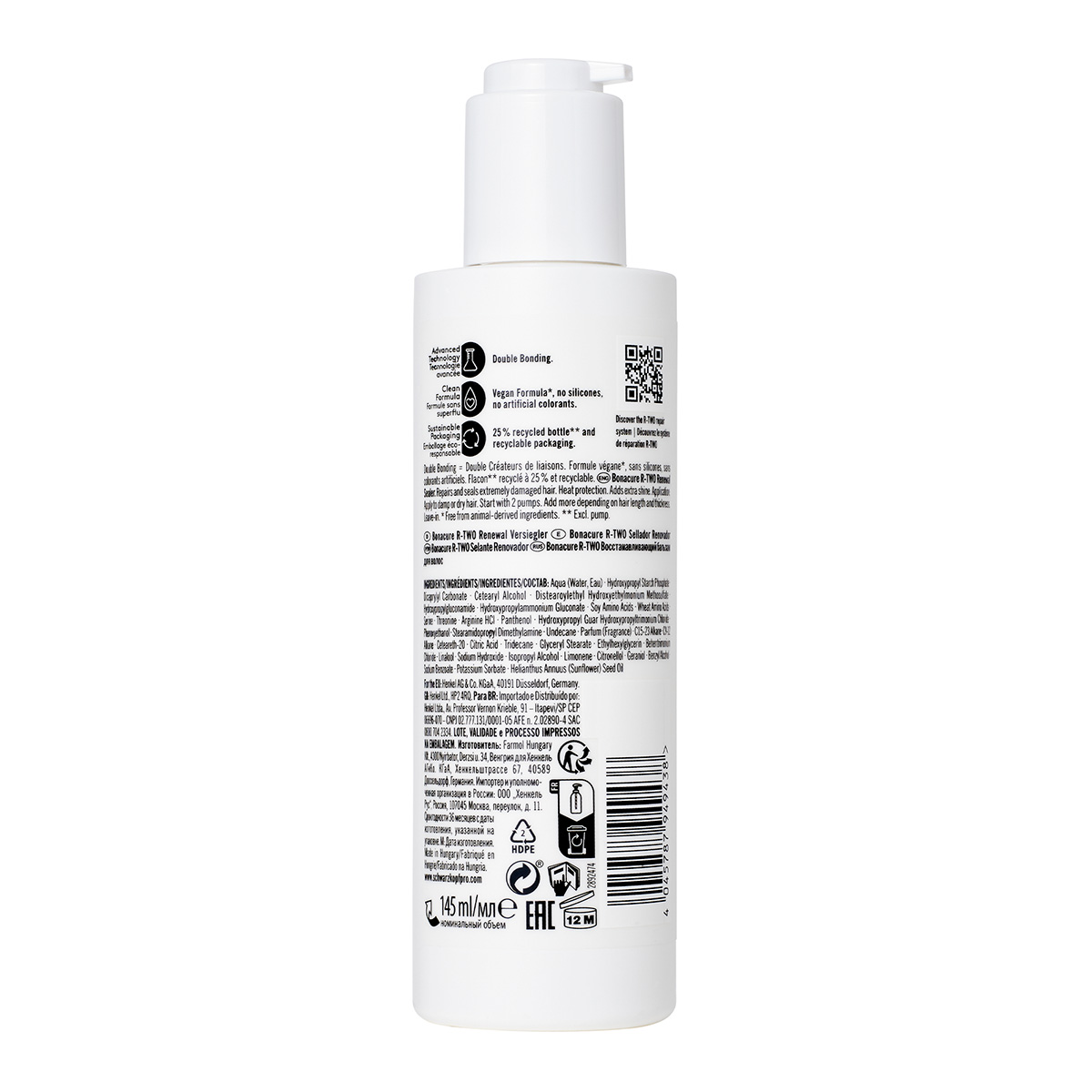Μια μάσκα μαλλιών που επανορθώνει και ενδυναμώνει άμεσα, το Bonacure R-TWO Renewal Sealer είναι ειδικά σχεδιασμένο για εξαιρετικά ταλαιπωρημένα μαλλιά που έχουν υποστεί χημική επεξεργασία και φυσική φθορά. Σφραγίζει το περιτρίχιο και δημιουργεί μια προστατευτική ασπίδα γύρω από τις ίνες της τρίχας, μειώνοντας το σπάσιμο και τις σπασμένες άκρες. Προσφέρει έλεγχο του φριζαρίσματος και προστασία από τη θερμότητα έως 230°C. Χωρίς σιλικόνες και τεχνητές χρωστικές.