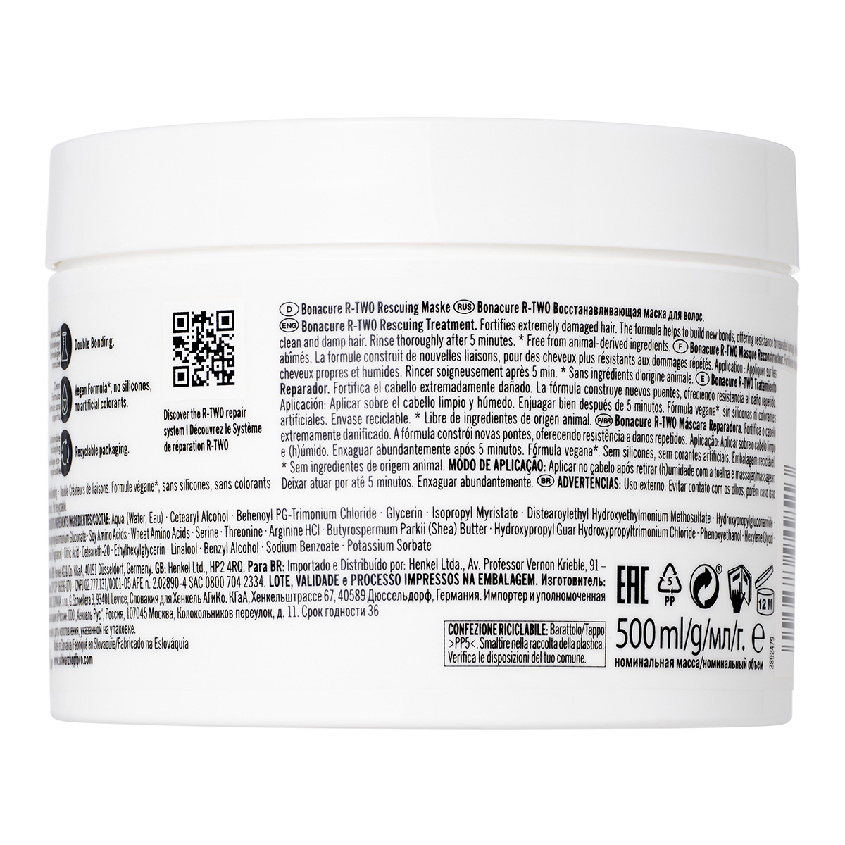 Μια εντατική θεραπεία ενδυνάμωσης μαλλιών, το Bonacure R-TWO Rescuing Treatment αναδομεί, επανορθώνει και ενισχύει τα εξαιρετικά κατεστραμμένα μαλλιά που έχουν υποστεί χημική επεξεργασία και φυσιολογική φθορά ενώ ταυτόχρονα ξεμπερδεύει, θρέφει και βελτιώνει το χτένισμα. Χωρίς σιλικόνες και τεχνητές χρωστικές.