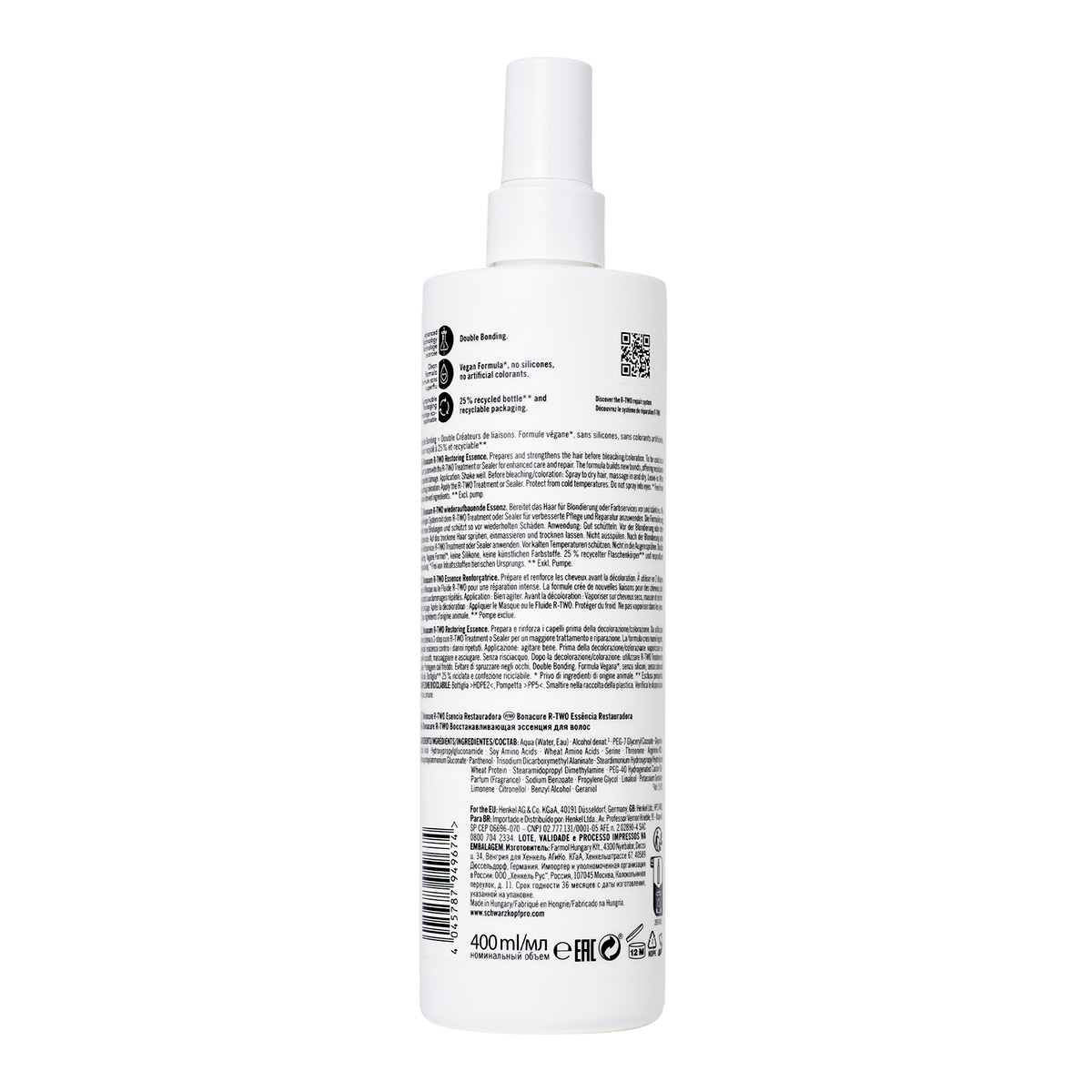 Το Bonacure R-TWO Restoring Essence προετοιμάζει και ενδυναμώνει τα μαλλιά πριν από τη βαφή ή το ξάνοιγμα και τις υπηρεσίες βαφής, όπως επίσης και κατά τη διάρκεια των υπηρεσιών περιποίησης. Χρησιμοποιήστε το σε συνδυασμό με το Rescuing Treatment ή το Renewal Sealer. Προλαμβάνει το σπάσιμο της τρίχας και βελτιώνει τη δύναμη των μαλλιών για να καταπολεμήσει τη φθορά που προκαλείται κατά την τεχνική επεξεργασία. Vegan σύνθεση*, χωρίς σιλικόνες και τεχνητά χρωστικά.