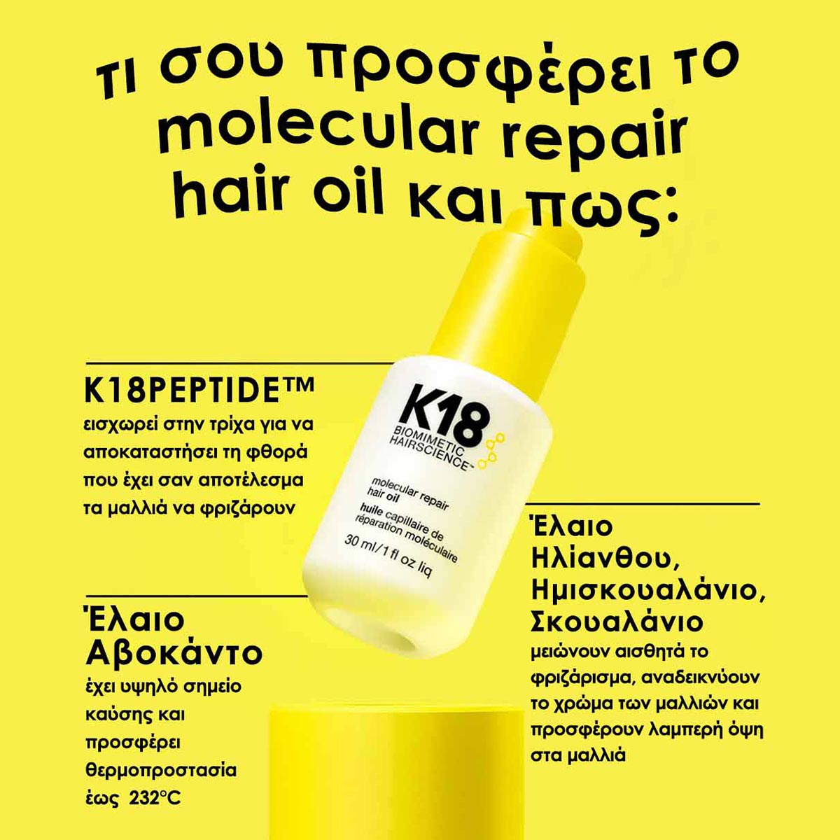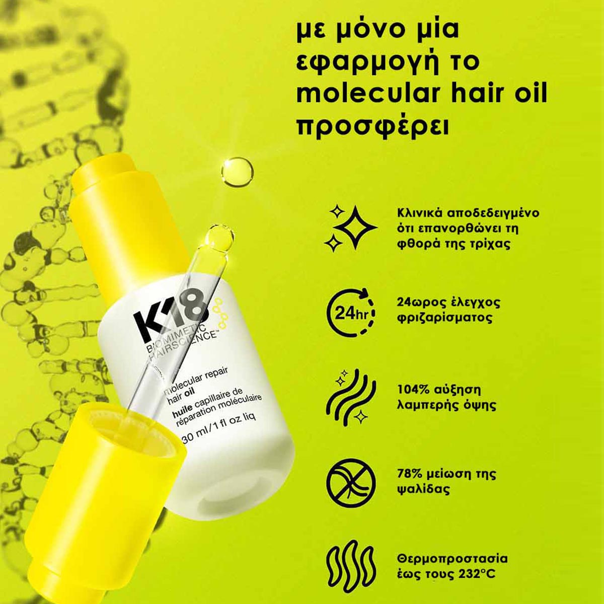 Το Κ18 Molecular Repair Hair Oil είναι ένα έλαιο μαλλιών που δεν βαραίνει. Δυναμώνει, λειαίνει την τρίχα και μειώνει αισθητά το φριζάρισμα. Αυτό το πρωτοποριακό ανάλαφρο έλαιο σχεδιάστηκε με τη βοήθεια της βιοτεχνολογίας, είναι κατάλληλο για όλους τους τύπους μαλλιών και προσφέρει ενδυνάμωση, αποκατάσταση της φθοράς, αιαθητή μείωση του φριζαρίσματος της ίνας της τρίχας σε δύο επίπεδα και ενίσχυση της λάμψης.