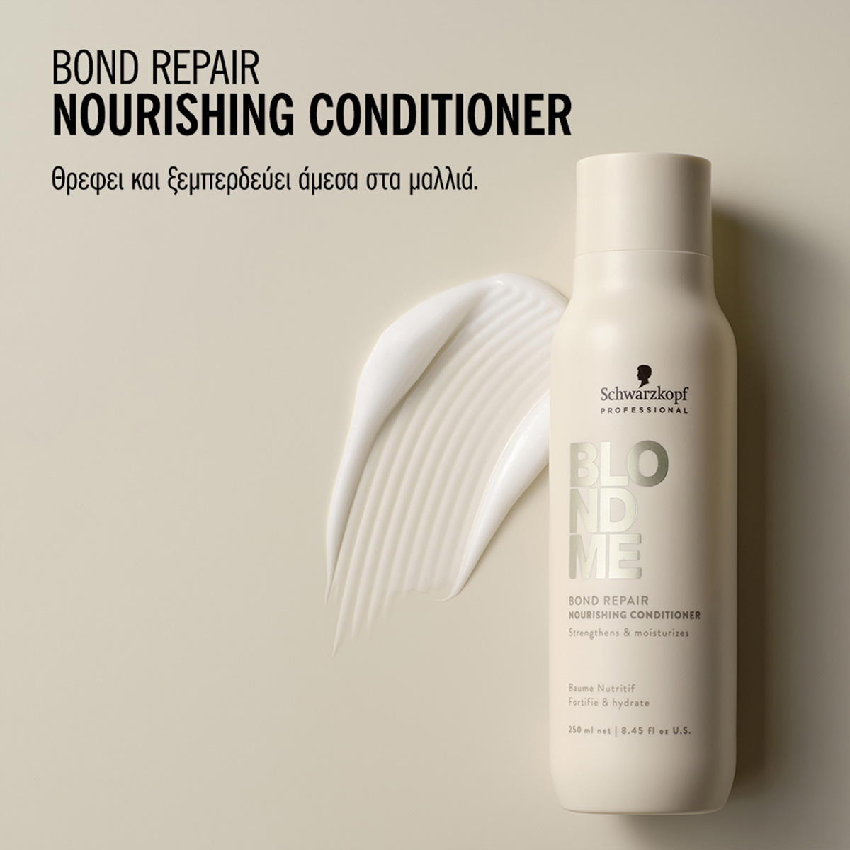 Η σειρά Blonde Essentials Bond Repair προσφέρει τα ιδανικά προϊόντα καθημερινής χρήσης για να διατηρήσετε τα ξανθά μαλλιά σας δυνατά και υγιή. Οι συνθέσεις με την τεχνολογία Bond Repair δυναμώνουν τα μαλλιά χτίζοτας τους εσωτερικούς δεσμούς της τρίχας, αποκαθιστώντας φθορές που ισοδυναμούν με δυο υπηρεσίες ξανοίγματος, μετά από μια μόνο χρήση.