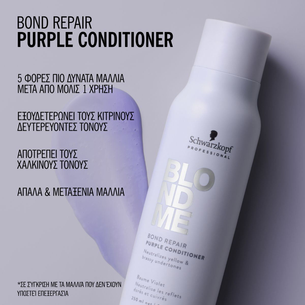 Η σειρά Purple Toning Bond Repair αφαιρεί τους ανεπιθύμητους κίτρινους δευτερεύοντες τόνους και αποτρέπει τους χάλκινους τόνους, διατηρώντας μια φρέσκια ψυχρή κατεύθυνση τόνου για βελτιωμένη ξανθιά διαύγεια, χωρίς αλλαγή του χρώματος των μαλλιών. Οι συνθέσεις με Bond Repair τεχνολογία ενισχύουν την τρίχα χτίζοντας εσωτερικούς δεσμούς, αποκαθιστώντας φθορές που ισοδυναμούν με δυο υπηρεσίες ξανοίγματος μετά απο μία μόνο χρήση.